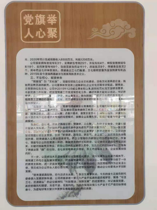 黨旗紅,企業(yè)興,雙贏之路靠引領(lǐng);黨旗舉,人心聚,三七葉子變黃金。黨建引領(lǐng)企業(yè)駛?cè)肟燔嚨?。“中國共產(chǎn)黨始終代表中國先進生產(chǎn)力的發(fā)展方向”,習(xí)近平總書記系列重要講話精神是我們非公企業(yè)黨建工作的指路明燈。下一步,公司將加大力度繼續(xù)抓好支部規(guī)范化建設(shè),提升黨建專業(yè)化能力和水平,將黨建工作與企業(yè)發(fā)展深度融合,打造融黨建學(xué)習(xí)、閱讀談心、學(xué)習(xí)培訓(xùn)等功能于一體的教育主陣地,進一步激發(fā)黨建帶動企業(yè)生產(chǎn)和創(chuàng)新新動能,鞏固黨組織作為企業(yè)主心骨,黨員成為企業(yè)帶頭人的引領(lǐng)作用,為企業(yè)經(jīng)營保駕護航,推動企業(yè)向更高水平創(chuàng)新發(fā)展。