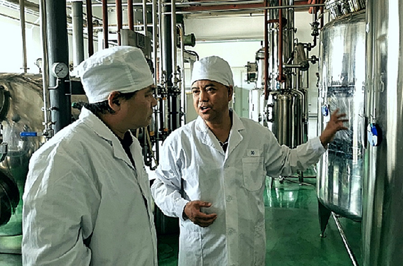 張云生董事長(右)在全封閉式生產(chǎn)車間向作者秦順福介紹三七系列產(chǎn)品現(xiàn)代化取純工藝流程
