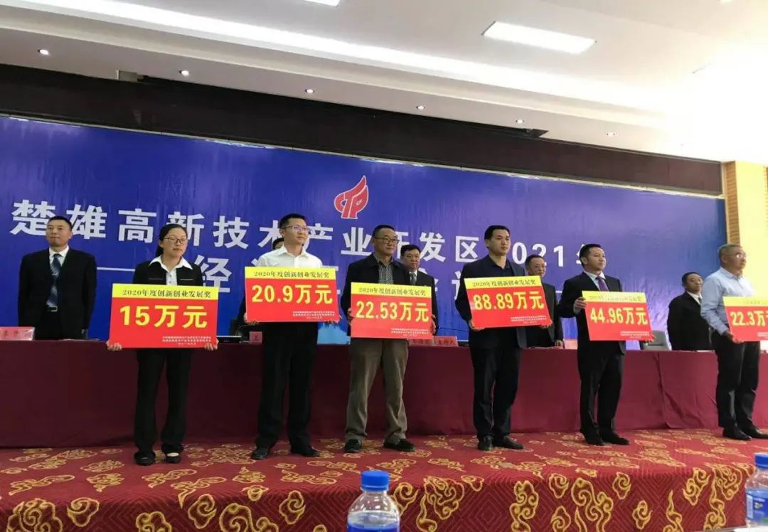 會(huì)上,高新區(qū)管委會(huì)對(duì)2020年獲得獎(jiǎng)勵(lì)和榮譽(yù)的企業(yè)進(jìn)行了表彰,公司共計(jì)獲得各項(xiàng)獎(jiǎng)勵(lì)補(bǔ)助200余萬元,其中獲得了2020年度創(chuàng)新營銷增值獎(jiǎng)132.82萬元,是高新區(qū)內(nèi)唯一一家獲得此項(xiàng)殊榮的企業(yè),獲獎(jiǎng)金額也是此次表彰大會(huì)數(shù)額最高者,因此,在眾多生物醫(yī)藥企業(yè)中博得頭彩,公司總經(jīng)理史云龍、行政副總楊新燕分別上臺(tái)領(lǐng)獎(jiǎng)。