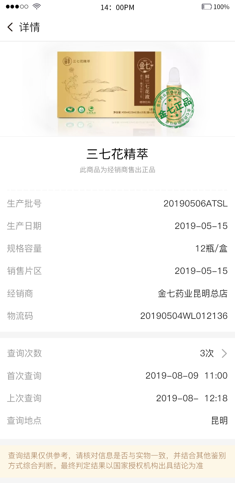 此外,NFC防偽標(biāo)簽還承載了豐富的信息。使用裝有金七藥業(yè)官方APP且?guī)в蠳FC功能的手機(jī)貼近此標(biāo)簽,除了可以查詢產(chǎn)品真?zhèn)涡畔⑼猓€可以讀取產(chǎn)品的其他相關(guān)信息:生產(chǎn)批號、生產(chǎn)日期、規(guī)格容量、經(jīng)銷商、物流碼,還可在APP上看到該產(chǎn)品的防偽查詢記錄。