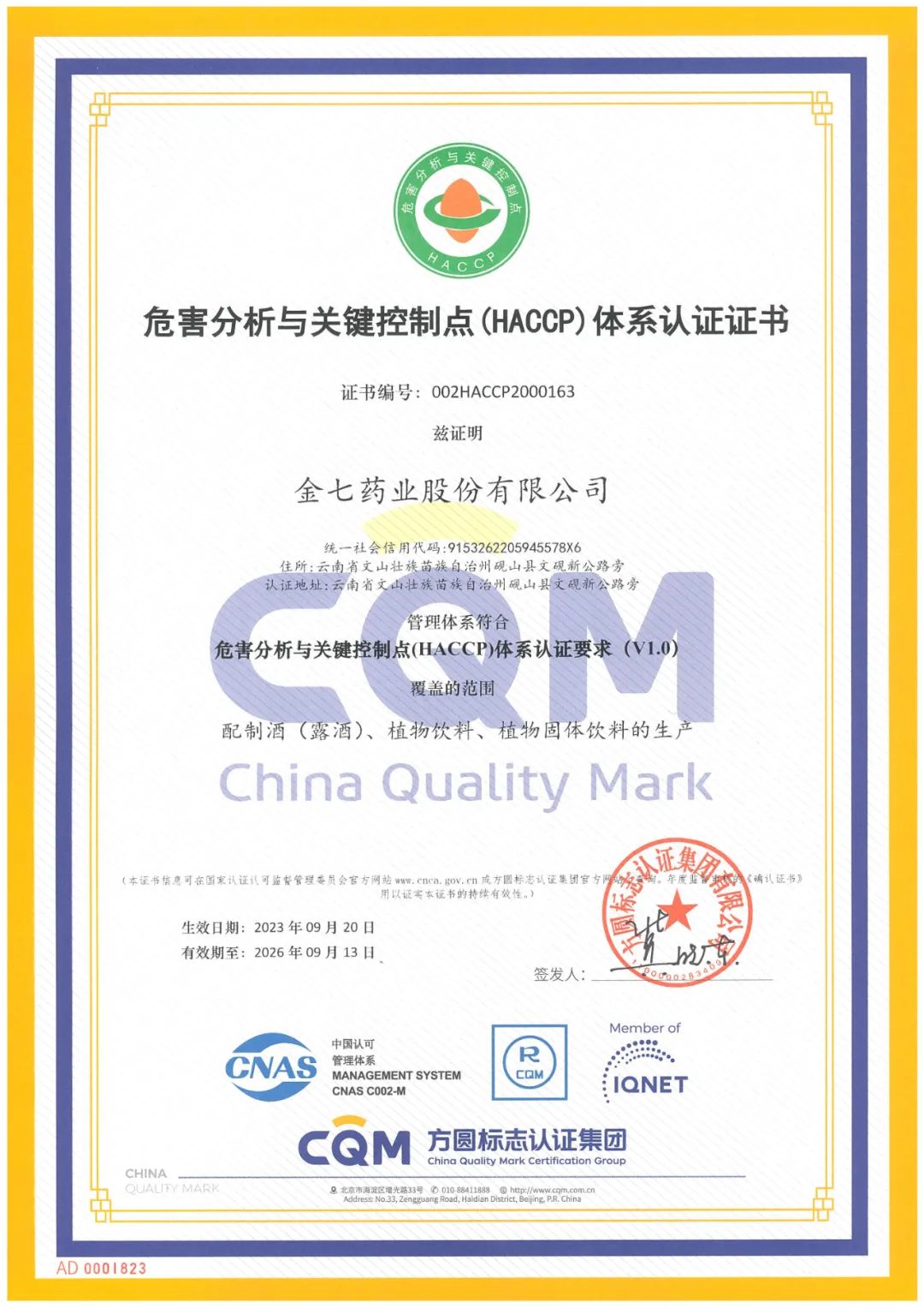 作為大健康領(lǐng)域生產(chǎn)企業(yè),金七藥業(yè)股份有限公司始終把食品安全放在首位,自2019年三七系列健康食品生產(chǎn)線正式引入HACCP及ISO:22000雙體系進行生產(chǎn)全過程監(jiān)控管理以來,分別于2020年9月14日、2023年9月20日兩輪獲得HACCP及ISO:22000雙體系認證證書,共取得食品類企業(yè)標準25個。 ISO22000 中文證書 ISO22000 英文證書 連續(xù)兩輪雙體系認證證書的取得是對金七藥業(yè)股份有限公司三七健康食品管理體系的肯定,也為更安全、更高效的三七系列健康食品引至更廣的健康領(lǐng)域貢獻了一已綿薄之力!三七的又一個全新時代已經(jīng)開啟!
